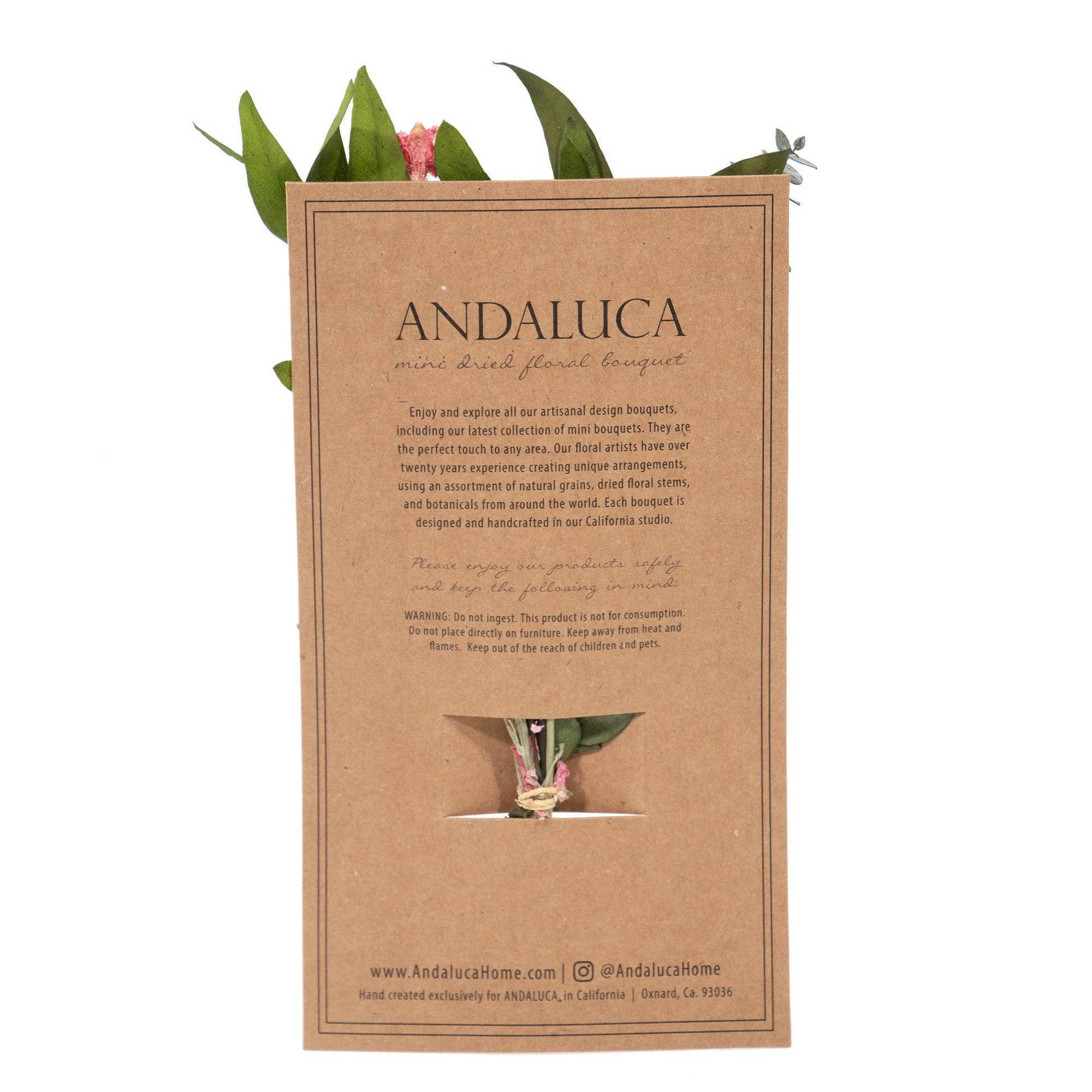 This beautiful MINI bouquet using an assortment of baby eucalyptus, willow, and pink larkspur to create this charming and petit mini bouquet arrangement. Each bouquet is designed and handcrafted in 8” long - bouquet is placed in a decorative paper card.