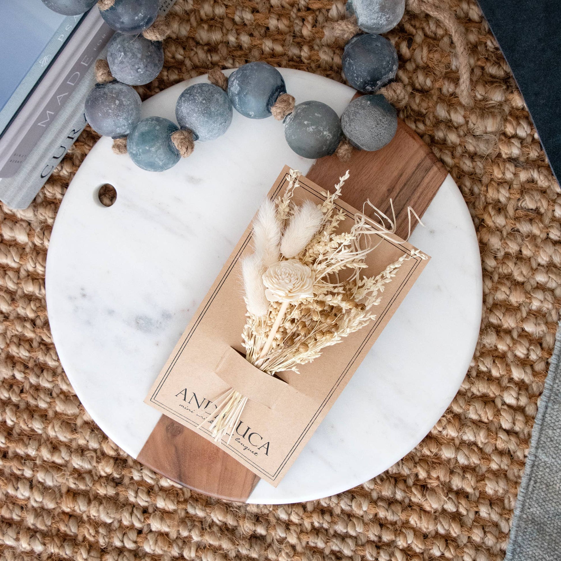 This beautiful MINI bouquet using an assortment of bunny tails, sola flower, and flax to create this charming and petit mini bouquet arrangement. Each bouquet is designed and handcrafted in our California design studio and is a perfect decorative accent to your tablescape or vignette. - 8" long - bouquet is placed in a decorative paper card.