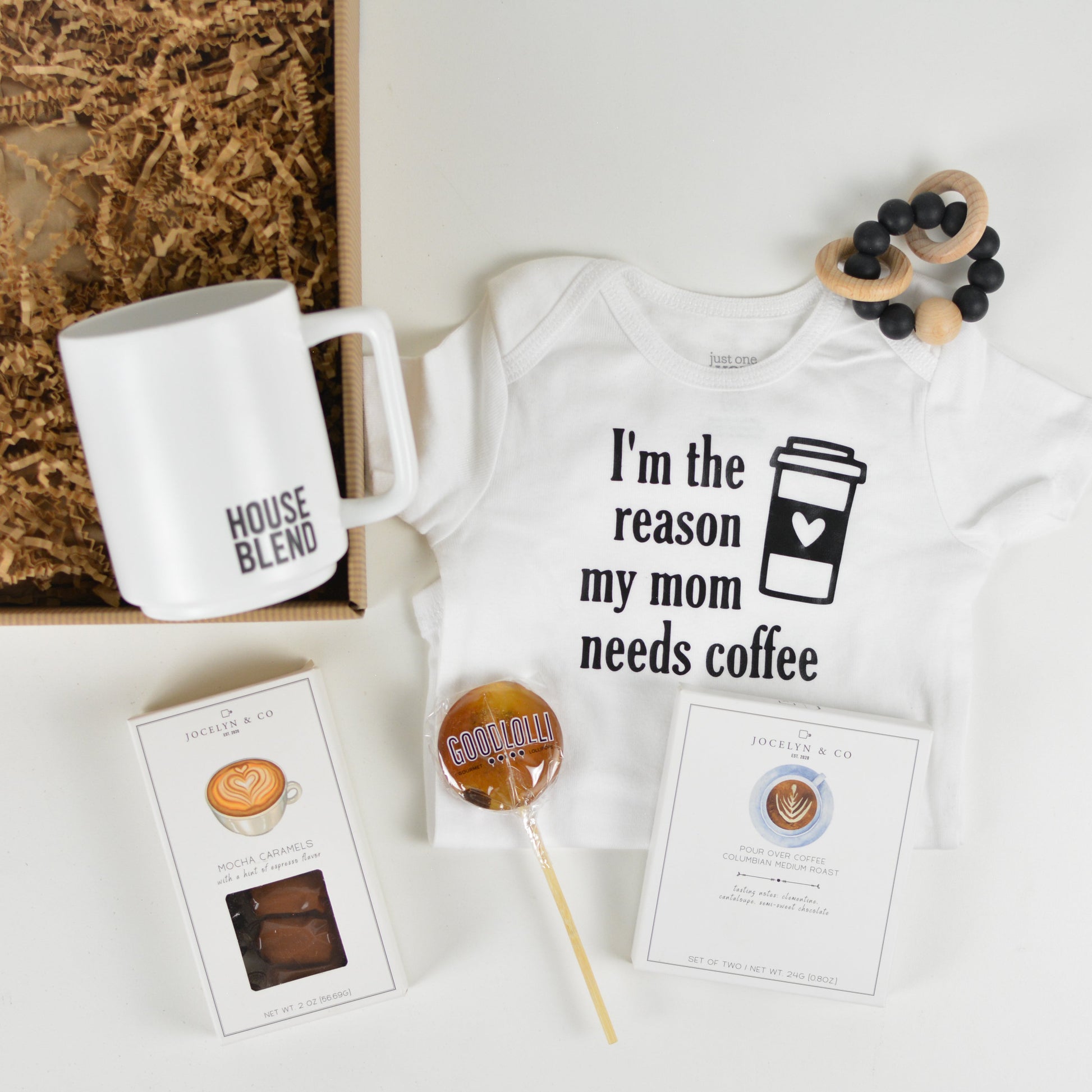 Indulge your caffeine-loving mom with our "My Mom Needs Coffee" set. This deluxe package includes a baby onesie, house blend mug, pour over coffees, mocha caramels, baby teether, and coffee lolli. Keep her going with all things caffeine.
