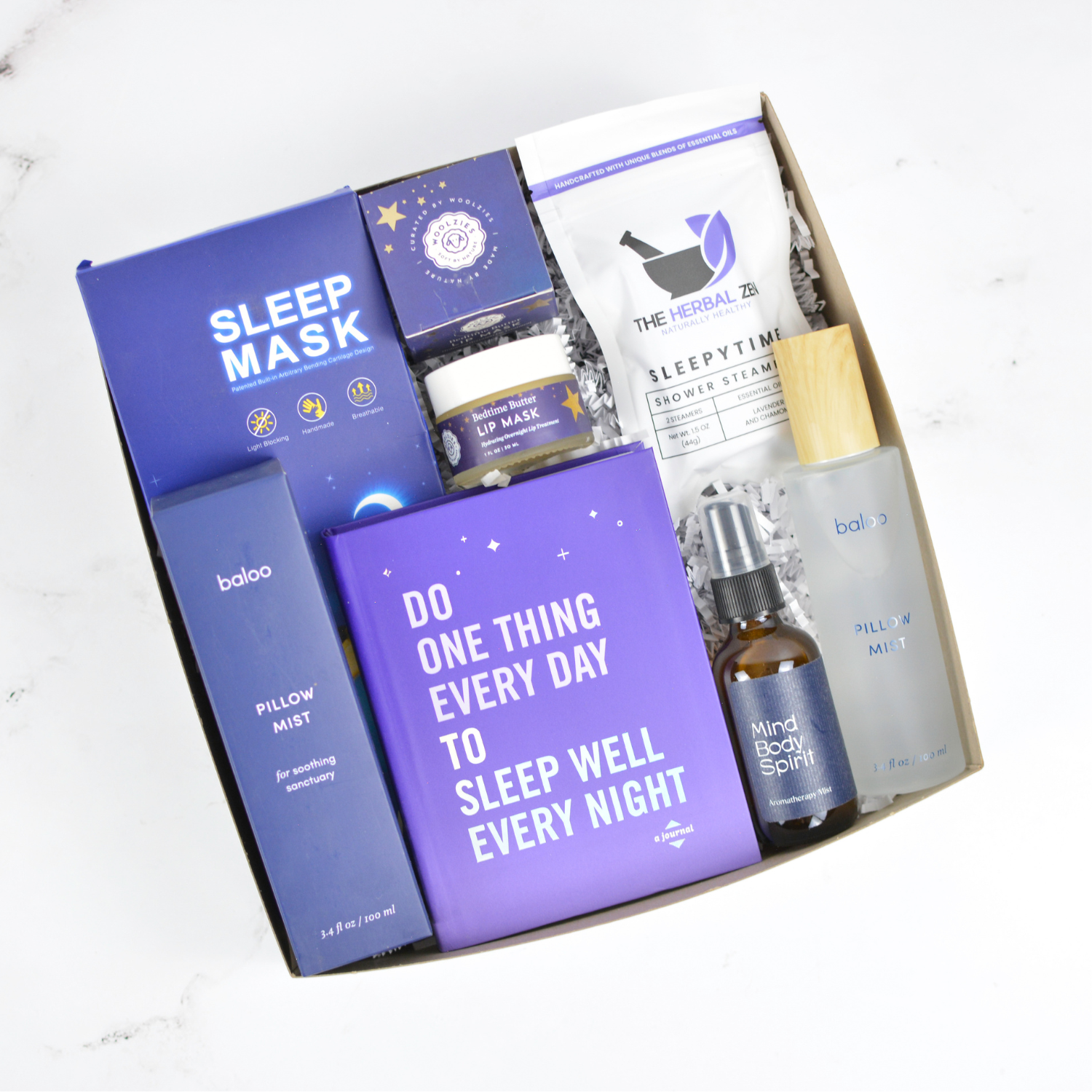 Encourage rest and relaxation with this soothing sleep inspired gift box. Inside is a luxurious sleep mask, pillow mist from Baloo, sleepytime shower steamers, and a nourishing lip mask. A calming journal offers space to reflect and unwind, while spa inspired touches make it easy to create a nighttime ritual that feels restorative and peaceful.